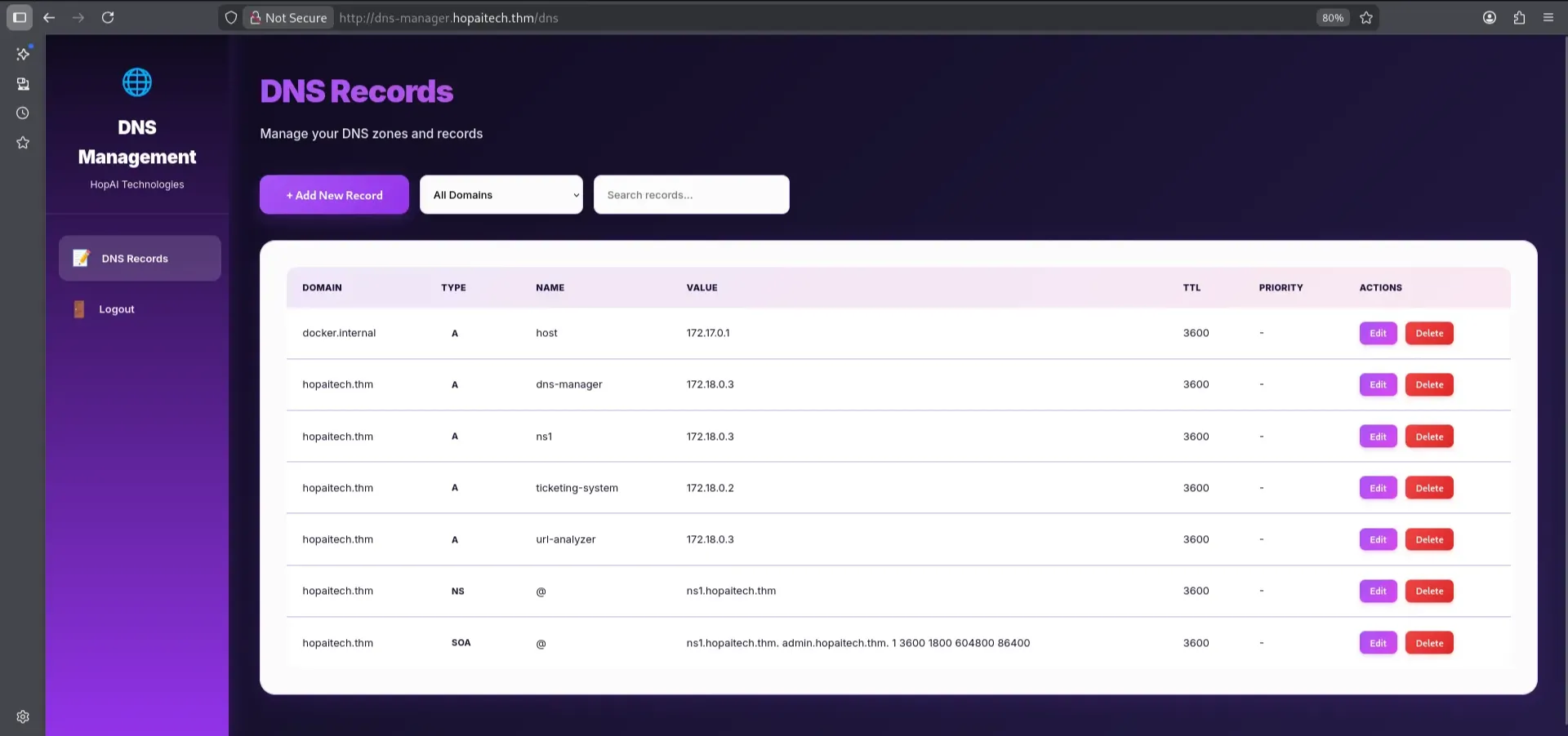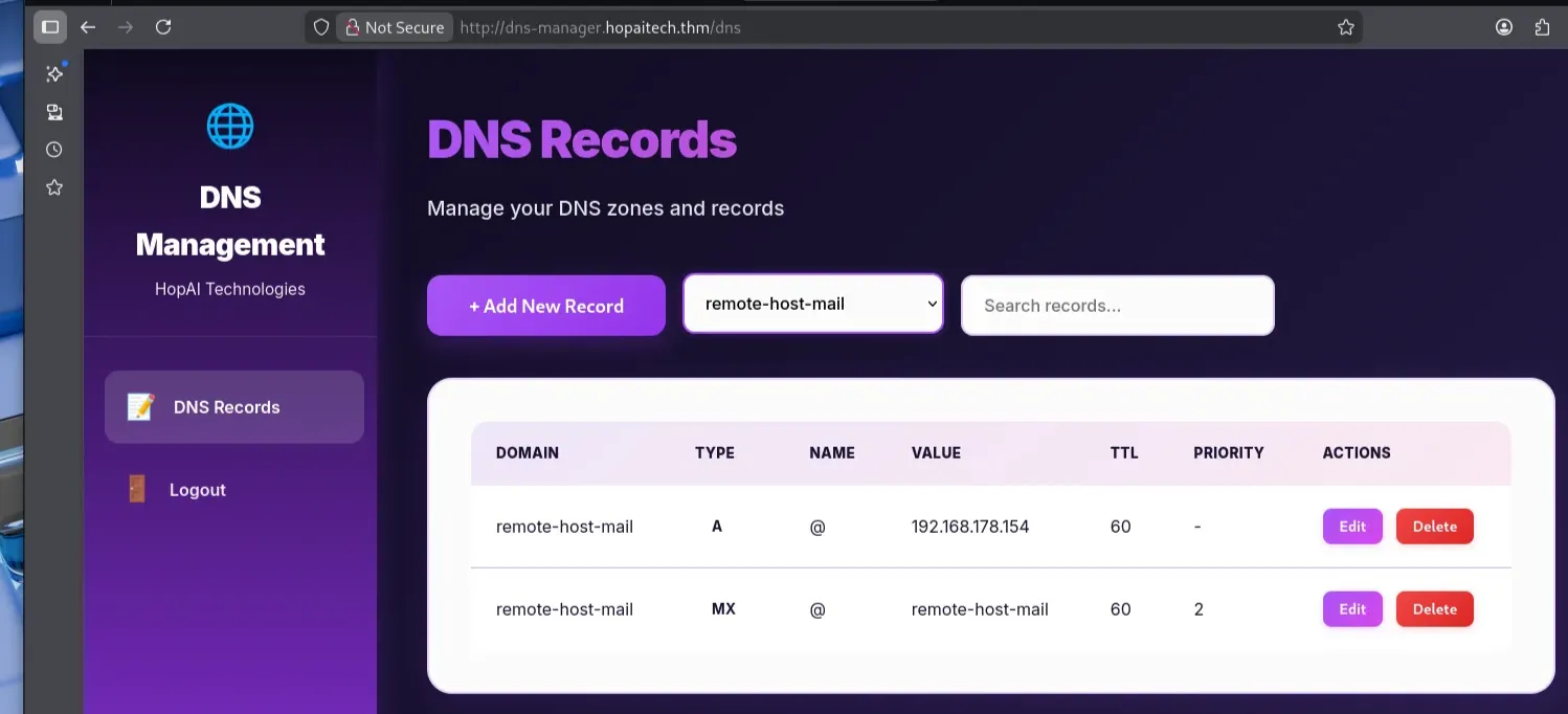 With the credentials obtained earlier, we were able to log in to the DNS Management Dashboard. The dashboard revealed several existing DNS records, including records for internal services and Docker infrastructure running on 172.17.0.1.