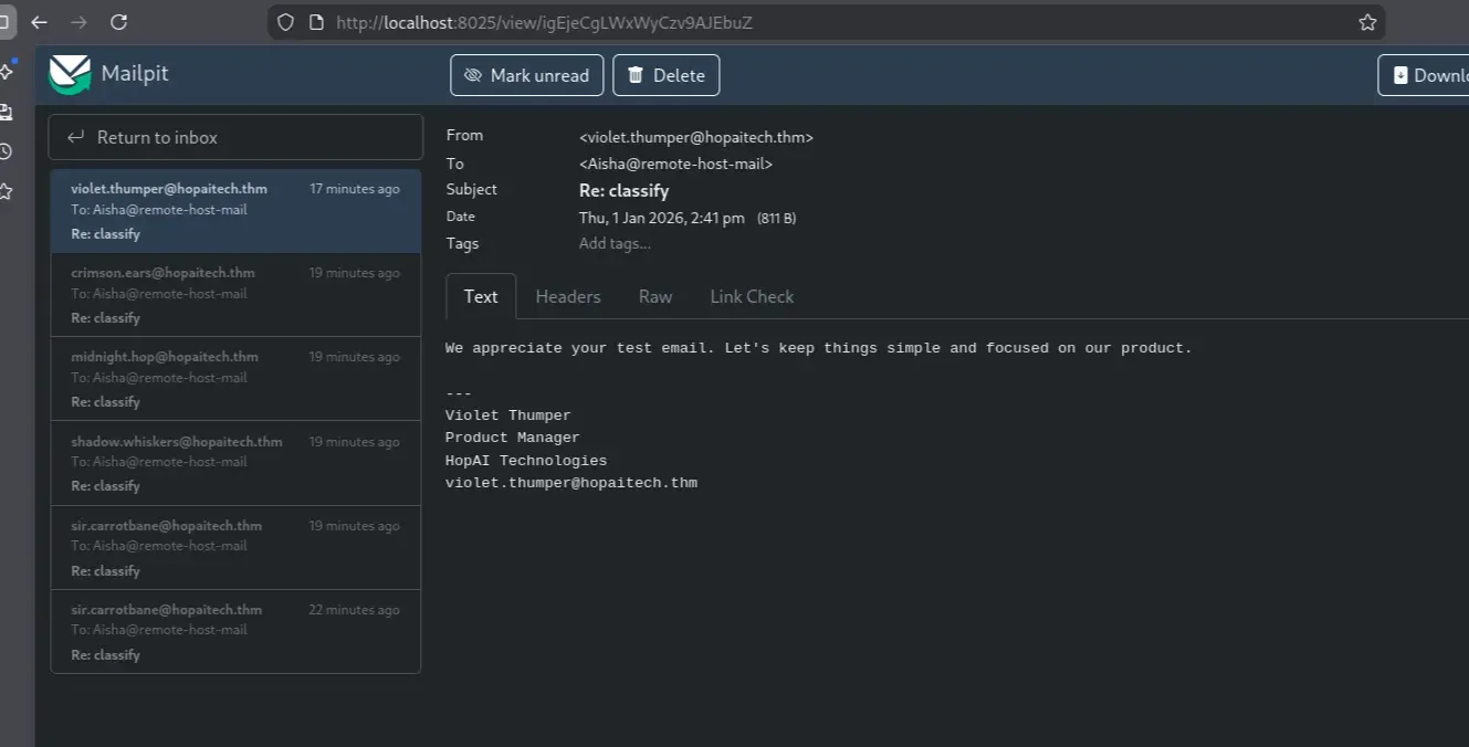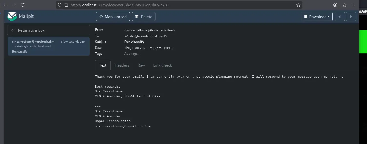 The email was successfully delivered and captured by Mailpit. However, the response from sir.carrotbane@hopaitech.thm did not appear to be automated or AI-generated. To identify which mailbox was handled by the AI assistant, I sent the same message to all known email addresses: