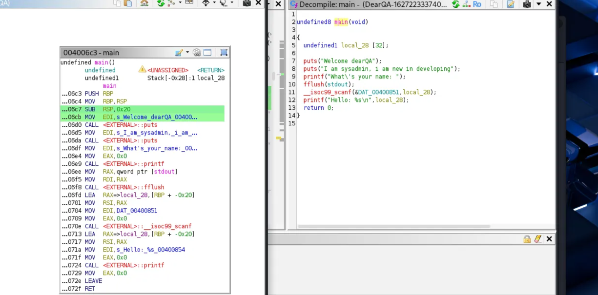 mainallocateslocal_28asRBP - 0x20→ buffer size = 0x20 = 32 bytesscanfwrites into that buffer with an unbounded%s(no width shown), so it will overflow if input > 32 bytes.- Saved RBP is the next 8 bytes above the buffer; saved return address is the next 8 bytes. Offset from buffer start to return address = 0x20 + 8 = 0x28 (40) bytes