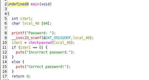 Loaded the binary into Ghidra, and here is the main function, the password is compared in the function checkpassword