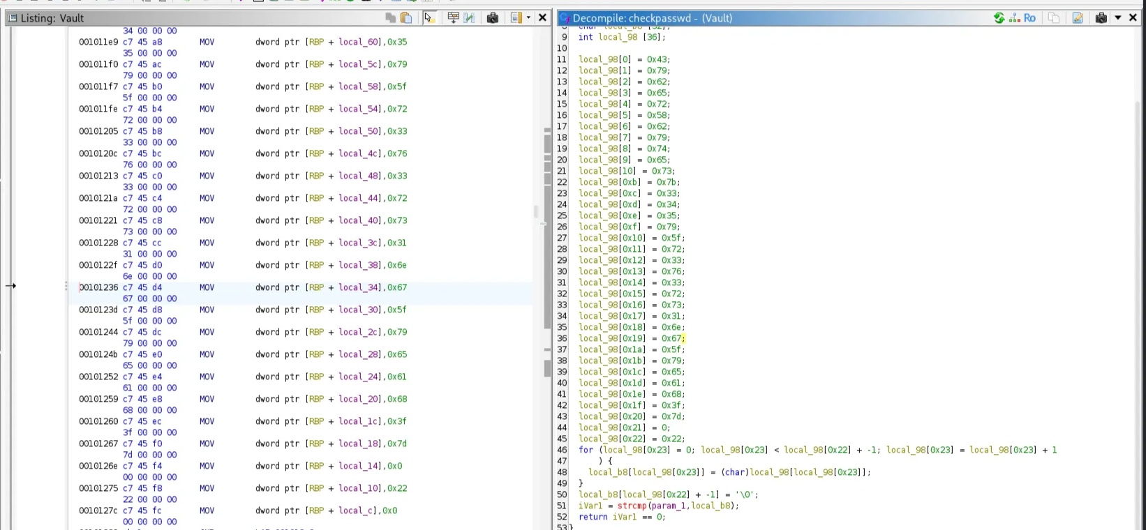 The correct password is saved in the local_98 array